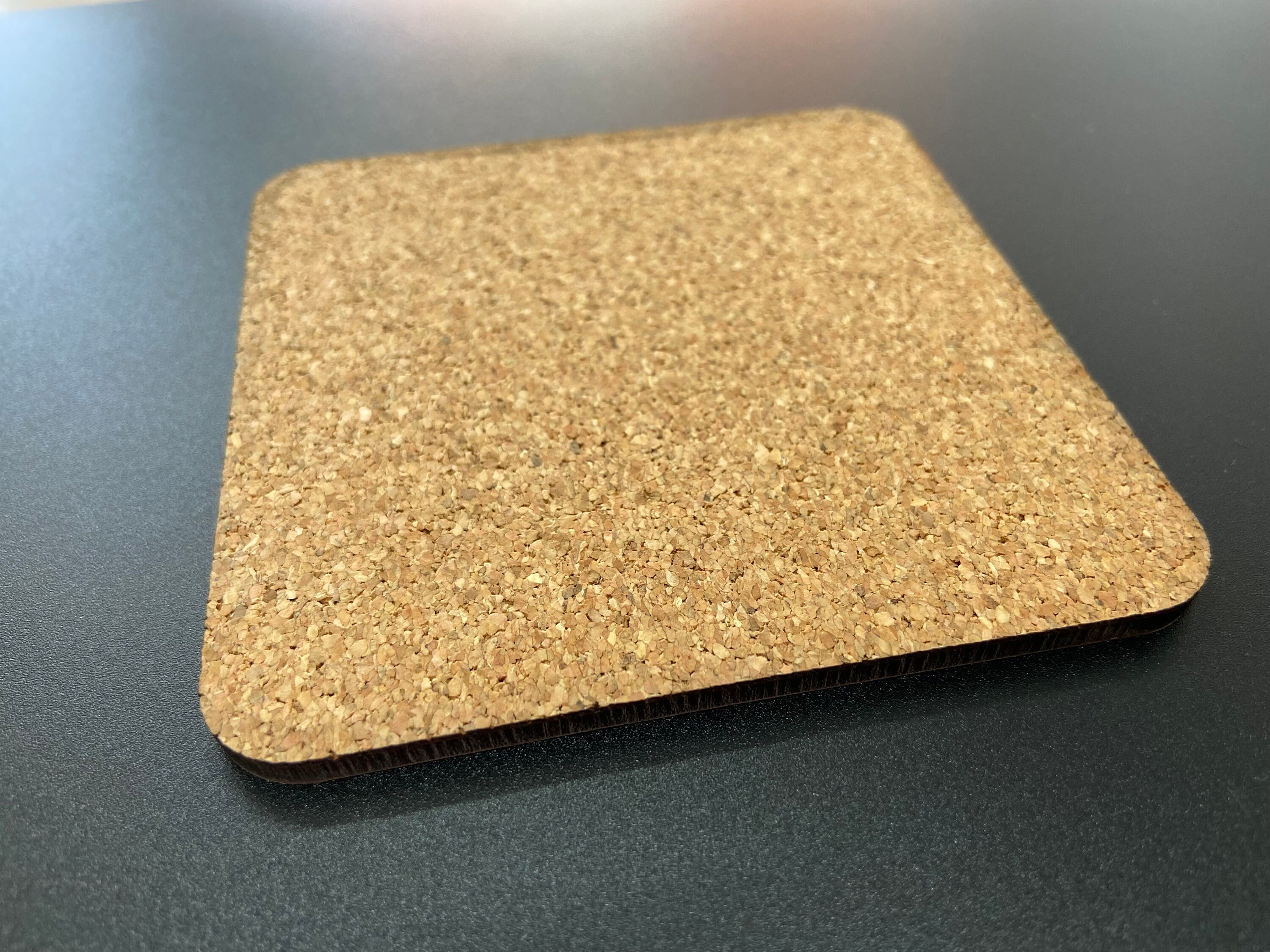 Hardboard drinks coaster, with a cork backing.